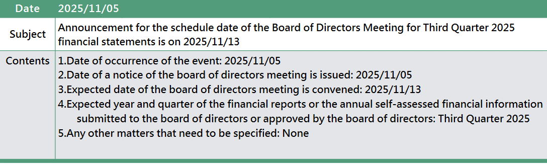 Announcement for the schedule date of the Board of Directors Meeting for Third Quarter 2025 financial statements is on 2025/11/13