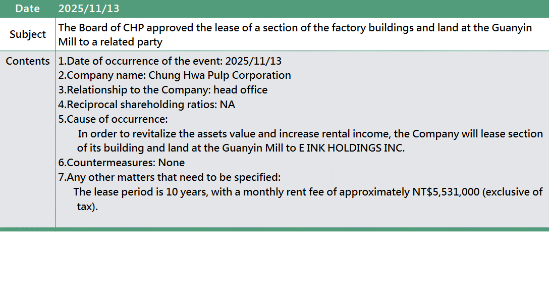 The Board of CHP approved the lease of a section of the factory buildings and land at the Guanyin Mill to a related party