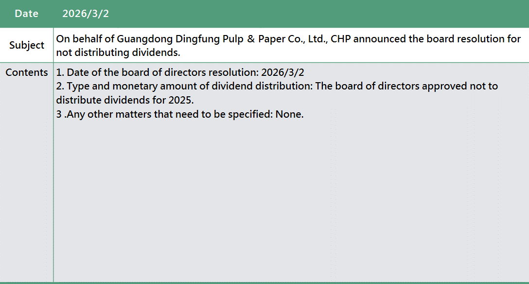 On behalf of Guangdong Dingfung Pulp & Paper Co., Ltd., CHP announced the board resolution for not distributing dividends.