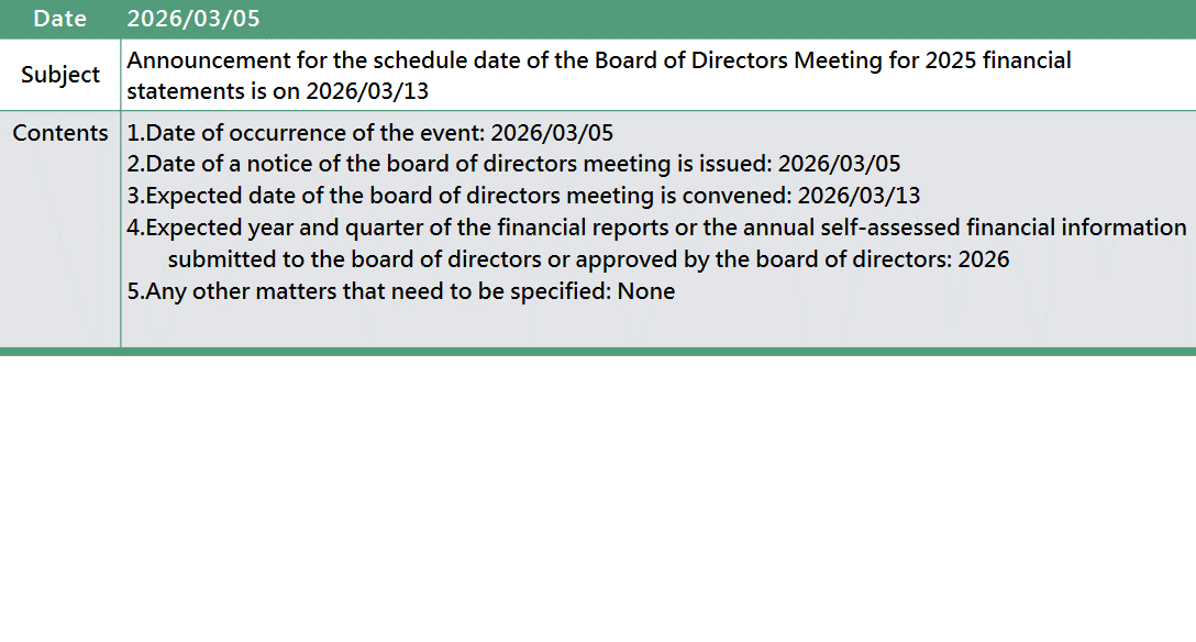 Announcement for the schedule date of the Board of Directors Meeting for 2025 financial statements is on 2026/3/13