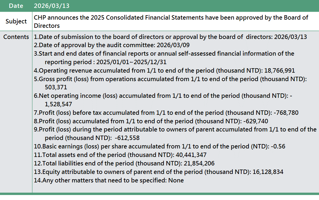 CHP announces the 2025 Consolidated Financial Statements have been approved by the Board of Directors