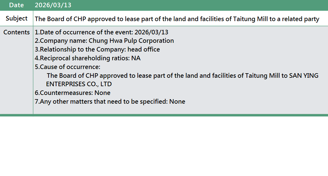 The Board of CHP approved to lease part of the land and facilities of Taitung Mill to a related party