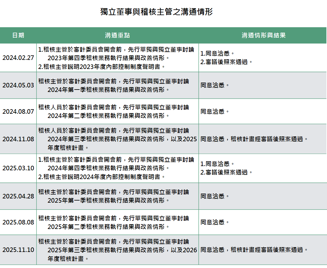 每季於審計委員會列席呈報「稽核業務報告」,內容包含本公司及各子公司稽核業務執行情形、稽核發現及異常事項改善。
