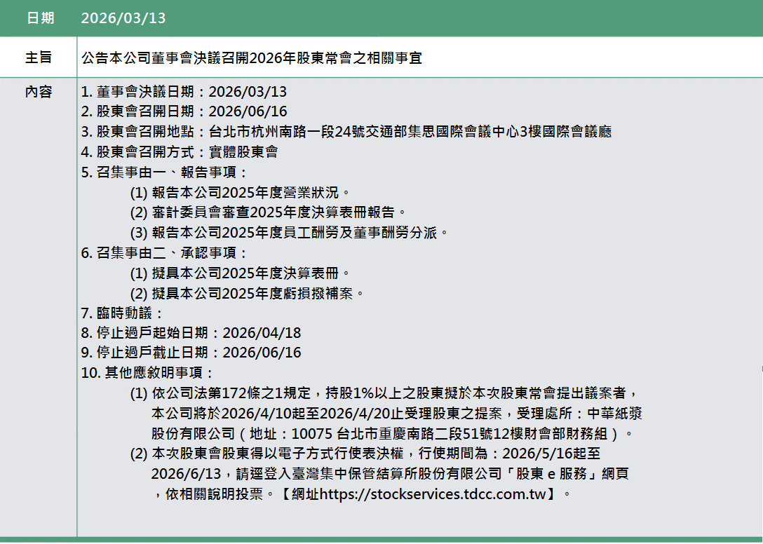 公告本公司董事會決議召開2026年股東常會之相關事宜