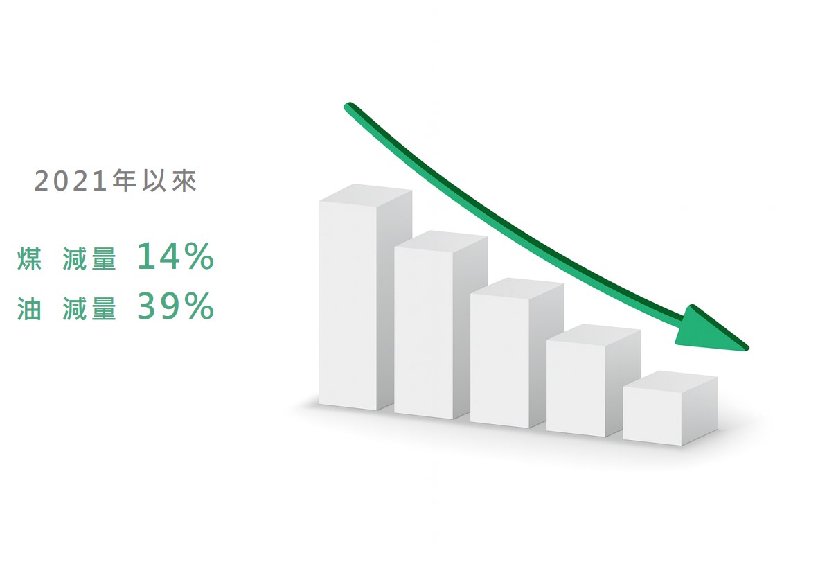 經過持續的努力,我們自2021年以來,煤的用量減少了14%,重油的用量減少了39%。
