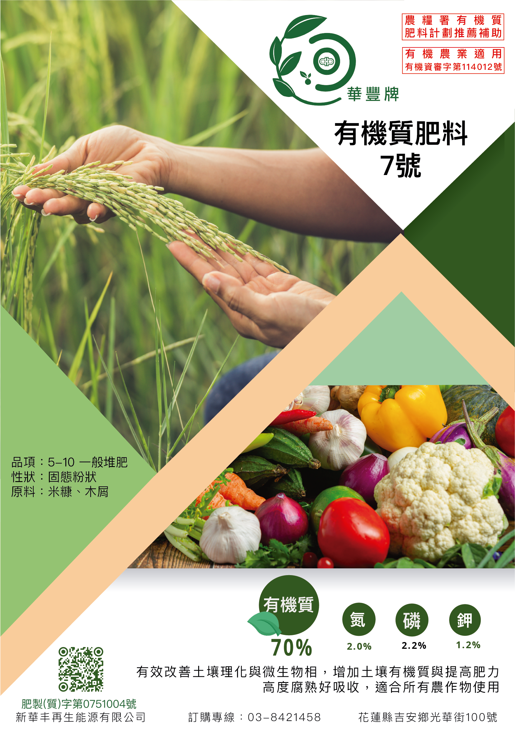 新華丰旗下「華豐牌有機質肥料7號」(肥製(質)字第0751004號),近期通過國立中興大學農產品驗證中心相關審認程度,納入「有機農業商品化資材」品牌並核予審認字號:有機資審字第114012號,可依規定於包裝標示「有機農業適用」。這項進展,代表華豐牌7號在品質與管理要求上,已具備支援有機農業使用的關鍵門檻,亦為新華丰深化「回到土地、支持農作」的重要里程碑。